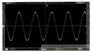 根據以上思想試製一台400 W的樣機,采用IRF3205作為推挽升壓的功率管,HER307作為整流二極管,全橋逆變功率管則采用IRF840.前級升壓的PWM波頻率設置為20 kHz,後級SPWM波的頻率設置為18 kHz,輸出濾波電感L為1 mH,輸出濾波電容C為4.7μF.實際測試正弦交流輸出電壓精度為220 V±1%,頻率精度為50 Hz±0.1%,THD小於1.5%,逆變效率大於87%,其滿負載時的試驗波形如圖7所示(輸出經20 kΩ/100 kΩ電阻分壓測到)。
