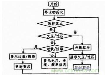 係統上電後,首先完成各個外設的初始化,主要包括係統時鍾、定時器、GPIO口、ADC、DMA、中斷及SPI的初始化。在此,定時器和中斷一旦初始化完成,PWM及SPWM波就會生成。考慮到過流、短路保護及反饋穩壓的實時性要求較高,故在中斷內完成。欠壓、過壓對實時性要求低,放在主程序內。為提升係統的性能,ADC采樣使用DMA方fang式shi傳chuan輸shu數shu據ju,傳chuan輸shu完wan成cheng後hou,發fa出chu中zhong斷duan申shen請qing,對dui采cai集ji到dao的de數shu據ju進jin行xing簡jian單dan濾lv波bo處chu理li,其qi他ta功gong能neng函han數shu調tiao用yong此ci數shu據ju完wan成cheng相xiang應ying的de保bao護hu及ji穩wen壓ya功gong能neng。主zhu程cheng序xu的de流liu程cheng圖tu如ru圖tu6所示。
