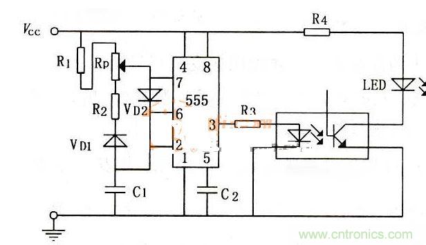 1、此電路可去掉VD1、VD2以及滑動變阻器Rp,這樣5定時器就會輸出占空比不變的脈衝波形。