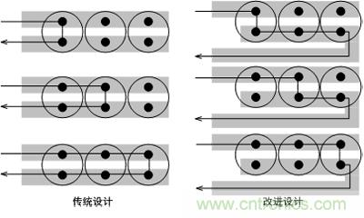 輸出濾波電容放置及走線對紋波噪聲至關重要,如圖1所suo示shi,傳chuan統tong設she計ji中zhong由you於yu到dao達da每mei個ge電dian容rong的de阻zu抗kang不bu一yi樣yang,所suo以yi高gao頻pin電dian流liu在zai三san個ge電dian容rong中zhong分fen配pei不bu均jun勻yun,改gai進jin設she計ji中zhong可ke以yi看kan出chu每mei個ge回hui路lu長chang度du相xiang當dang即ji高gao頻pin電dian流liu會hui均jun勻yun分fen配pei到dao每mei個ge電dian容rong中zhong。