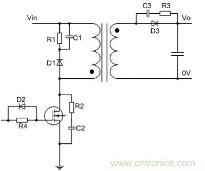 一般選擇場效應管的反向恢複時間要比二極管D1慢2~3倍,以避免形成直通電流,此電流會產生很強的磁場,可增大輸出噪聲幹擾,所以可人為的通過柵極電阻R4來減慢開關管的開關速度。為了不影響關斷速度可以在柵極電阻並聯一個二極管D2如圖2所示。