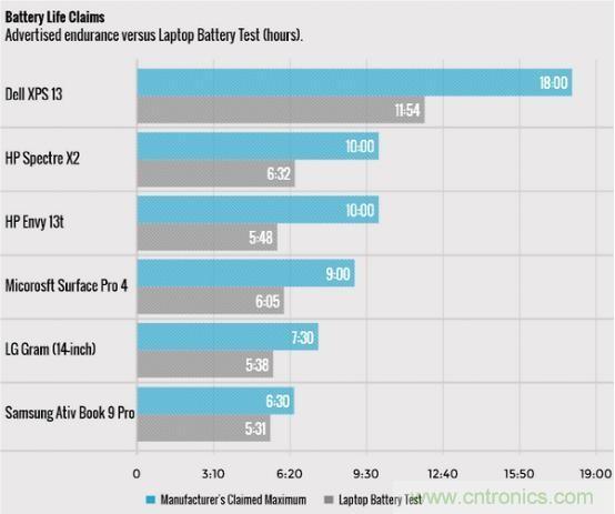 外媒Laptop Mag近jin日ri針zhen對dui市shi場chang中zhong主zhu流liu筆bi記ji本ben進jin行xing了le一yi項xiang電dian池chi壽shou命ming比bi對dui測ce試shi,通tong過guo筆bi記ji本ben電dian池chi測ce試shi得de出chu接jie近jin於yu現xian實shi使shi用yong環huan境jing下xia的de電dian池chi壽shou命ming,再zai與yu官guan方fang宣xuan稱cheng的de電dian池chi壽shou命ming相xiang比bi對dui。