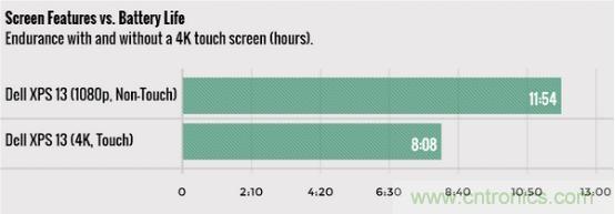拋(pao)開(kai)電(dian)池(chi)技(ji)術(shu)本(ben)身(shen)止(zhi)步(bu)不(bu)前(qian)的(de)原(yuan)因(yin),筆(bi)記(ji)本(ben)電(dian)腦(nao)電(dian)池(chi)壽(shou)命(ming)沒(mei)有(you)進(jin)步(bu)的(de)主(zhu)要(yao)原(yuan)因(yin)在(zai)於(yu)其(qi)他(ta)硬(ying)件(jian)發(fa)展(zhan)。雖(sui)然(ran)處(chu)理(li)器(qi)每(mei)一(yi)年(nian)都(dou)在(zai)功(gong)耗(hao)方(fang)麵(mian)擁(yong)有(you)一(yi)定(ding)進(jin)步(bu),但(dan)4K屏幕、觸摸屏、超輕薄設計,對電池壽命都產生了消極的影響。以戴爾XPS 13為例,1080P非觸摸屏版本相比4K觸摸屏版本的電池壽命長了約4小時。