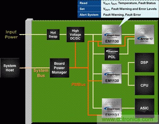 (2)另一常見的係統電源要求是能夠進行遠程監視,對電源各參數進行實時監視、故障報警和相應調節。而最簡單、最便宜、最緊湊的方式是使用集成了遠程監視功能和相應的通信總線的電源調節器。通過智能電壓ID(SmartVID)特性,Altera的Arria 10 FPGA和SoC通過PMBus接口,確定與Enpirion電壓調節器係統之間所需的VCC電壓和通信,將內核電壓軌盡可能動態調整到最小,而不會犧牲係統性能。同時,支持PMBus的Enpirion的ED8101P0xQI單相數字控製器,與ET4040QI大電流電源配對使用,可實現對FPGA的多種遠程監視和低功耗特性。