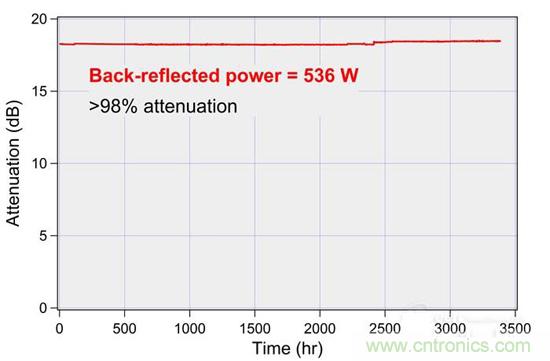因為工件表麵的不規則、與(yu)表(biao)麵(mian)法(fa)線(xian)對(dui)齊(qi)不(bu)精(jing)確(que)以(yi)及(ji)處(chu)理(li)光(guang)學(xue)元(yuan)件(jian)采(cai)光(guang)角(jiao)度(du)的(de)限(xian)製(zhi),典(dian)型(xing)的(de)回(hui)返(fan)激(ji)光(guang)通(tong)常(chang)隻(zhi)占(zhan)一(yi)小(xiao)部(bu)分(fen)激(ji)光(guang)器(qi)的(de)功(gong)率(lv),此(ci)外(wai),回(hui)返(fan)現(xian)象(xiang)通(tong)常(chang)持(chi)續(xu)時(shi)間(jian)很(hen)短(duan),例(li)如(ru)打(da)孔(kong)這(zhe)樣(yang)的(de)應(ying)用(yong)。但(dan)是(shi),部(bu)分(fen)光(guang)纖(xian)激(ji)光(guang)器(qi)的(de)設(she)計(ji)會(hui)導(dao)致(zhi)難(nan)以(yi)處(chu)理(li)甚(shen)至(zhi)無(wu)法(fa)處(chu)理(li)反(fan)射(she)材(cai)料(liao)。回(hui)返(fan)造(zao)成(cheng)的(de)損(sun)傷(shang)通(tong)常(chang)是(shi)由(you)於(yu)光(guang)功(gong)率(lv)在(zai)聚(ju)合(he)物(wu)材(cai)料(liao)上(shang)能(neng)量(liang)堆(dui)積(ji)而(er)導(dao)致(zhi)過(guo)熱(re)或(huo)燃(ran)燒(shao)引(yin)起(qi)的(de)。nLIGHT altaTM光(guang)纖(xian)激(ji)光(guang)器(qi)會(hui)剝(bo)除(chu)耦(ou)合(he)到(dao)饋(kui)送(song)光(guang)纖(xian)的(de)回(hui)返(fan)光(guang),並(bing)將(jiang)其(qi)引(yin)導(dao)到(dao)水(shui)冷(leng)光(guang)束(shu)吸(xi)收(shou)器(qi),激(ji)光(guang)在(zai)此(ci)被(bei)轉(zhuan)換(huan)為(wei)熱(re)量(liang),不(bu)涉(she)及(ji)任(ren)何(he)聚(ju)合(he)物(wu),從(cong)而(er)消(xiao)除(chu)了(le)主(zhu)要(yao)的(de)損(sun)壞(huai)原(yuan)因(yin)。無(wu)聚(ju)合(he)物(wu)的(de)隔(ge)離(li)器(qi)旨(zhi)在(zai)連(lian)續(xu)吸(xi)收(shou)消(xiao)除(chu)>500 W的回返激光,如壽命測試所示。