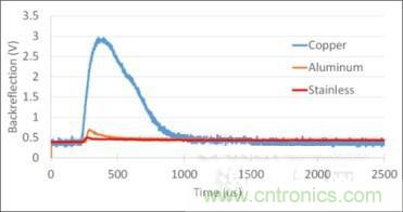 (圖片說明:在進行不鏽鋼、鋁和銅金屬板打孔時從工件返射的激光信號示例。)