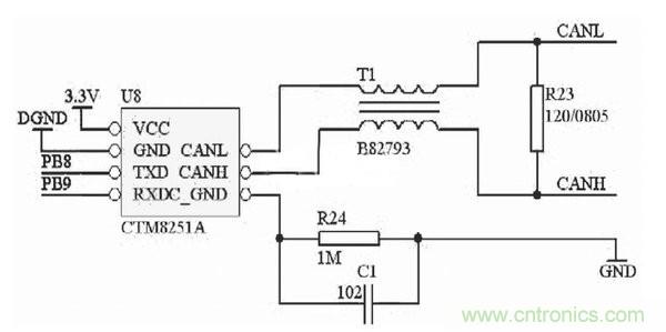 CAN-bus接口電路采用+3.3V供電,選擇CTM8251A隔離CAN收發器。該芯片是3.3V工業級的隔離CAN收發器。CTD0信號連接主控芯片的CAN控製器的發送腳,CRD0信號連接CAN控製器的接收腳。CTM隔離CAN收發器內有一完整的CAN-bus隔離收發器電路,可以將來自CAN控製器的邏輯電平轉換為CAN總線信號,並具有DC2500V隔離功能。另外,CTM收發器可以選擇集成ESD保護功能的“T”係列,從而省略外擴的ESD保護器件。共模扼流圈T1起著EMI增強的功能,用於提高設備的EMI能力;共模扼流圈T1的電感參數很重要,選擇CAN-bus專用器件,比如EPCOS的B82793扼流圈。