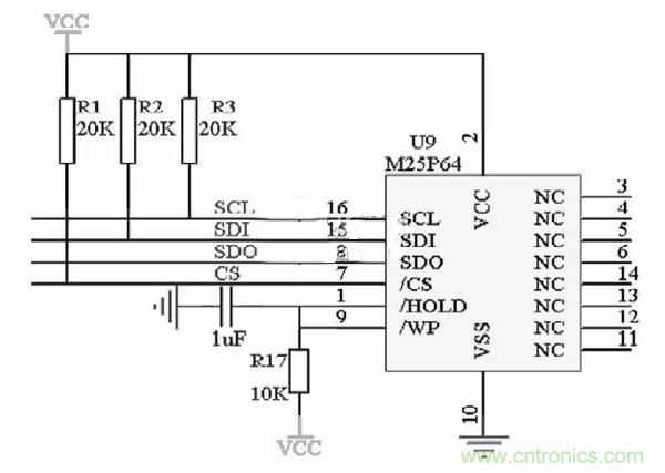 圖3為ARM與Flash的連接電路圖。以下幾點說明:(1)SCL串行時鍾信號,由主設備產生;(2)SDO主設備數據輸出,從設備數據輸入;(3)SDI主設備數據輸入,從設備數據輸出;(4)CS為片選,從設備使能信號,由主設備控製。(5)對7、15、16角外接上拉電阻,提高芯片輸入信號的噪聲容限增強抗幹擾能力。