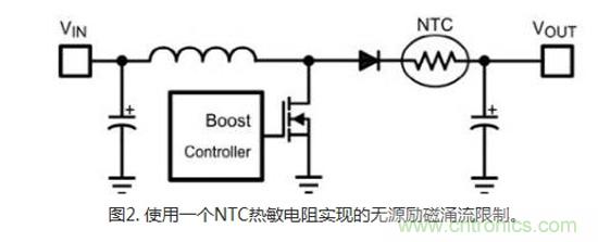最簡單的限流機製是采用一個負溫度係數 (NTC) 熱敏電阻(圖2)。由於在冷卻時出現高阻抗,NTC在(zai)開(kai)始(shi)啟(qi)動(dong)時(shi)限(xian)製(zhi)勵(li)磁(ci)湧(yong)流(liu)。其(qi)自(zi)身(shen)功(gong)率(lv)耗(hao)散(san)所(suo)導(dao)致(zhi)的(de)自(zi)發(fa)熱(re)可(ke)使(shi)阻(zu)抗(kang)下(xia)降(jiang),從(cong)而(er)能(neng)夠(gou)使(shi)更(geng)多(duo)的(de)電(dian)流(liu)流(liu)過(guo)。這(zhe)個(ge)方(fang)法(fa)的(de)優(you)勢(shi)在(zai)於(yu)簡(jian)便(bian)易(yi)行(xing)且(qie)成(cheng)本(ben)低(di)廉(lian)。然(ran)而(er),在(zai)惡(e)劣(lie)條(tiao)件(jian)下(xia)使(shi)用(yong)這(zhe)個(ge)方(fang)法(fa)會(hui)帶(dai)來(lai)某(mou)些(xie)缺(que)點(dian)。比(bi)如(ru),在(zai)汽(qi)車(che)發(fa)動(dong)機(ji)艙(cang)等(deng)溫(wen)度(du)大(da)幅(fu)變(bian)化(hua)的(de)環(huan)境(jing)內(nei),會(hui)出(chu)現(xian)使(shi)NTC初始阻抗降低的高環境溫度;此外,如果不仔細管理整個環境運行條件,就會導致過多的勵磁湧流。如果出現重新啟動的情況,NTC器件溫度也許會在下一次加電之前尚未冷卻。在輸出電容完全放電時,由於散熱速度較慢,NTC對於勵磁湧流的限製會變到最低。此外,如果負載出現短路故障,NTC將無法限製比所選標稱運行條件高的電源電流。最後,NTC方法對於單一功能保護有效,但是由於使用的是無源組件,這個方法也會受到某些限製。