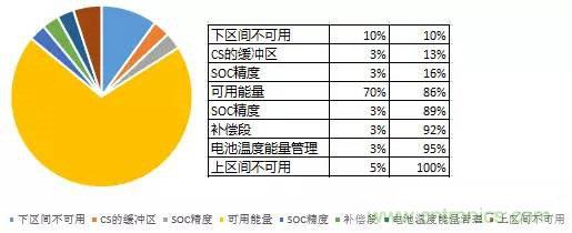 首先,我們考慮一下能量分配,在SOC從整個100%到零或者說整個電池能量管理過程可以分解為:上下兩段留存的不可用能量(純電動汽車上下留餘更多一些)、可用能量、SOC誤差、調節電池溫度所需要的能量、容量下降的補償、插電式混合動力汽車的CS緩衝區(純電動沒有這段)。