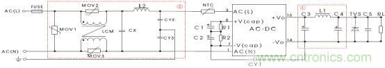 LS03-16BxxSS係列電源,如果需應用在電磁環境比較惡劣的場合中,為使產品工作穩定且不被電磁幹擾輕易損壞,建議在電源輸入端口增加相應的EMC外圍電路,以滿足一定指標的電磁兼容性能,如圖(二)所示為推薦電路供參考: