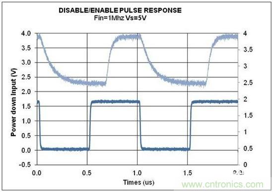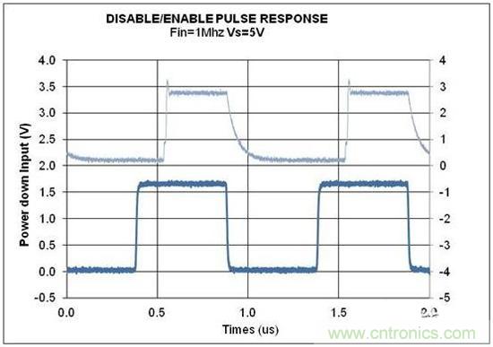 如下圖 2 所示,OPA836具有關斷功能,其開啟/關閉速度相當快,可輕鬆適應高占空比。