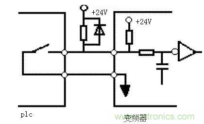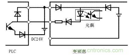 當輸入開關信號進入變頻器時,有時會發生外部電源和變頻器控製電源(DC24V)之間的串擾。正確的連接是利用PLC電源,將外部晶體管的集電極經過二極管接到PLC。如圖4所示。