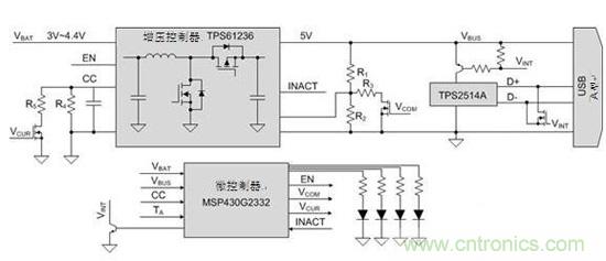 管理移動電源子係統的活動對保持電池的能級至關重要,避免將其浪費在內部功能上。該參考設計中包含一個MSP430?微控製器(MCU),其作為內務處理型MCU,用來優化移動電源的功耗。當MCU檢測負荷較低時,它會關閉大部分子係統;待機狀態下,移動電源僅消耗22mA電量。為防止電池出現高放電電流,MCU會調整限流。當負荷電流發生變化時,MCU還會對輸出電壓做出小幅調整,從而提供一個穩壓良好的輸出。最後,MCU通過其集成的模數轉換器(ADC)測量電池電壓和溫度。然後,MCU驅動LED來顯示電池電壓並監視溫度,以保持移動電源處於安全工作範圍。
