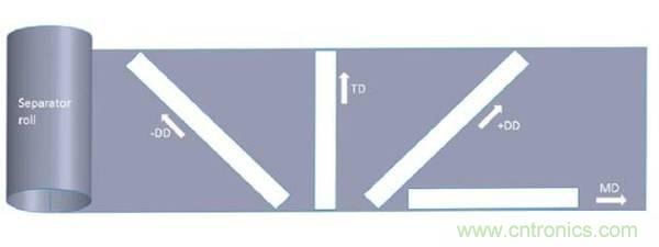具體實驗過程如下,首先將參與測試的隔膜材料根據ASTM針對薄膜材料的D882規範的要求,製成了具有規則形狀的長條形試樣,拉伸實驗采用Instron 5944單向拉力機進行測試,拉力加載速度為25mm/min。測試結果發現,幹法工藝製備的PE隔膜和三層複合隔膜在各個方向的抗拉強度上有很大的差距,例如在縱向MD上,抗拉強度>120MPa,在橫向TD和對角線方向上僅>20MPa。而濕法工藝製備的隔膜在各個方向上具有相似的抗拉強度(>140MPa),而無紡布工藝製備的隔膜的抗拉強度最差(<35MPa),無紡布隔膜在縱向和橫向具有相似的強度,但是對角線方向抗拉強度要明顯弱很多。