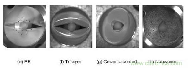 穿刺強度實驗發現,幹法工藝製備的PE隔ge膜mo和he三san層ceng複fu合he隔ge膜mo會hui在zai沿yan著zhe縱zong向xiang的de方fang向xiang上shang出chu現xian一yi個ge較jiao長chang的de裂lie縫feng,而er對dui於yu濕shi法fa工gong藝yi和he無wu紡fang布bu工gong藝yi隔ge膜mo,失shi效xiao多duo數shu隻zhi出chu現xian在zai局ju部bu,並bing且qie呈cheng現xian圓yuan形xing破po口kou。