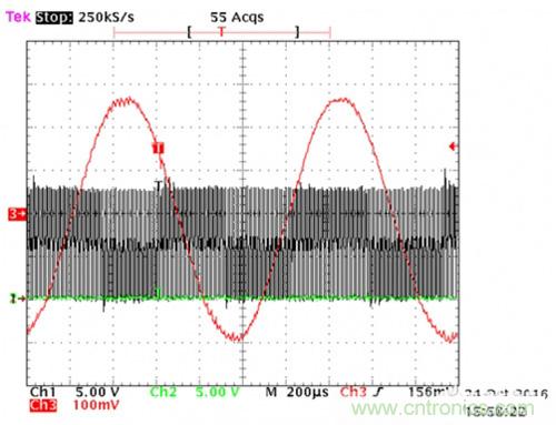 直列式電流感應方法看似是最合理的,因為這是最終要測量的電流。但這種方法存在一個問題。驅動MOSFET或IGBT的PWM信xin號hao對dui電dian流liu感gan應ying放fang大da器qi造zao成cheng嚴yan重zhong破po壞huai。感gan測ce電dian阻zu處chu的de共gong模mo信xin號hao從cong電dian源yuan電dian壓ya被bei驅qu動dong到dao接jie地di,具ju有you非fei常chang快kuai速su的de瞬shun態tai開kai關guan特te性xing,而er電dian流liu感gan應ying放fang大da器qi試shi圖tu測ce量liang感gan測ce電dian阻zu本ben身shen的de小xiao差cha分fen信xin號hao。圖tu2是由PWM逆變器產生的正弦相電流(紅色波形)的示波器截圖。這種情況下,PWM頻率為100兆赫(MHz),由LMG5200 GaN半橋功率級提供(更多詳細信息,請參見底部的TI設計)。需(xu)要(yao)注(zhu)意(yi)的(de)是(shi),快(kuai)速(su)開(kai)關(guan)信(xin)號(hao)是(shi)直(zhi)列(lie)式(shi)電(dian)流(liu)感(gan)應(ying)放(fang)大(da)器(qi)測(ce)量(liang)相(xiang)電(dian)流(liu)時(shi)所(suo)接(jie)收(shou)的(de)信(xin)號(hao)。這(zhe)就(jiu)像(xiang)在(zai)有(you)颶(ju)風(feng)的(de)情(qing)況(kuang)下(xia),當(dang)杯(bei)子(zi)在(zai)海(hai)上(shang)漂(piao)浮(fu),而(er)試(shi)圖(tu)測(ce)量(liang)杯(bei)中(zhong)液(ye)體(ti)一(yi)樣(yang)。難(nan)怪(guai)大(da)多(duo)數(shu)設(she)計(ji)師(shi)會(hui)考(kao)慮(lv)使(shi)用(yong)低(di)側(ce)感(gan)應(ying)!下麵我們將介紹另外一種方法。