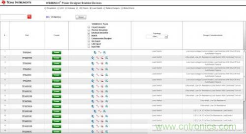開始設計前,請點擊TI WEBENCH設計中心的Power Designer Enabled Devices鏈接。從頂部列表中選擇“Load Switch”(負載開關)選項(參見圖 1)。單擊“Create”(創建)按鈕,WEBENCH工具將打開所選擇的負載開關的產品頁麵。