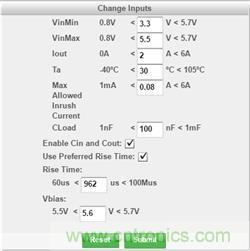 這是WEBENCH設計器工具中最有用的一個控製台,因為它會告訴你特定應用時負載開關預計運行情況。浪湧電流、上升時間、效率、導通電阻和功率耗散隻是眾多計算結果的一部分。若要改變這些數值,隻需在“Change Inputs”控(kong)製(zhi)台(tai)中(zhong)輸(shu)入(ru)新(xin)的(de)設(she)計(ji)參(can)數(shu)即(ji)可(ke)。這(zhe)樣(yang)做(zuo)可(ke)以(yi)看(kan)到(dao)更(geng)改(gai)設(she)計(ji)參(can)數(shu)會(hui)如(ru)何(he)改(gai)變(bian)負(fu)載(zai)開(kai)關(guan)的(de)行(xing)為(wei)。例(li)如(ru),更(geng)改(gai)輸(shu)出(chu)電(dian)容(rong)會(hui)影(ying)響(xiang)負(fu)載(zai)開(kai)關(guan)的(de)浪(lang)湧(yong)電(dian)流(liu)。
