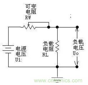 Uo=Ui×RL/(RW+RL),因此通過調節RW的大小,即可改變輸出電壓的大小。請注意,在這個式子裏,如果我們隻看可調電阻RW的值變化,Uo的輸出並不是線性的,但如果把RW和RL一起看,則是線性的。還要注意,我們這個圖並沒有將RW的引出端畫成連到左邊,而畫在右邊。雖然這從公式上看並沒有什麼區別,但畫在右邊,卻正好反映了“采樣”和“反饋”的概念----實際中的電源,絕大部分都是工作在采樣和反饋的模式下的,使用前饋方法很少,或就是用了,也隻是輔助方法而已。