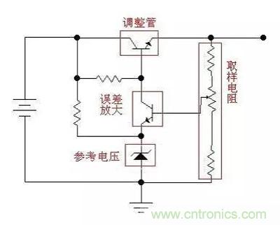 讓我們繼續:如果我們用一個三極管或者場效應管,來代替圖中的可變阻器,並通過檢測輸出電壓的大小,來控製這個“變阻器”阻zu值zhi的de大da小xiao,使shi輸shu出chu電dian壓ya保bao持chi恒heng定ding,這zhe樣yang我wo們men就jiu實shi現xian了le穩wen壓ya的de目mu的de。這zhe個ge三san極ji管guan或huo者zhe場chang效xiao應ying管guan是shi用yong來lai調tiao整zheng電dian壓ya輸shu出chu大da小xiao的de,所suo以yi叫jiao做zuo調tiao整zheng管guan。