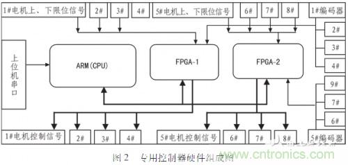 專用控製器由arm(LPC2214)、fpga(EP2C5T144C8)、驅動器接口電路、編碼器接口電路、限位檢測電路和電源電路等組成,如圖2為一個八軸電機控製器的硬件組成圖。arm通過串口實現與上位機之間的通信,解析從上位機獲得的控製指令,並通過fpgachanshengxiangyingshuchuxinhaogeiqudongqijiekou,qudongqijiekouwaijiequdongqi。bianmaqixinhaozuoweiweizhifankuixinhaotongbianmaqijiekouxianglian,xingchengweizhihuanfankui。xianweixinhaozuoweianquanjiancexinhaotongxianweijiancejiekouxianglian,weizhenggexitongtianjiayidaoanquanbaozhang。