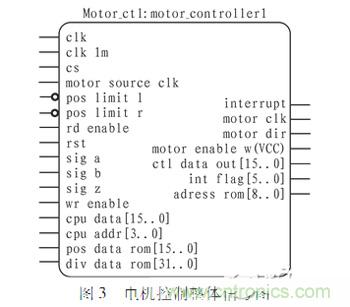 專用控製器在完成整個控製的過程中,arm隻負責指令解析、控製指令發送、實時數據上傳等任務,fpga才是多軸專用控製器的核心。通過Verilog HDL語言在fpga內部實現了加減速曲線、編碼器信號辯向及四細分、絕對位移記錄等功能。圖3為電機控製的整體輸入、輸出信號圖,通過片選信號CS、讀有效信號rd_enable、寫有效圖信號wr_enable進行電機通道選擇。圖4給出了1#通道控製的fpga內部邏輯示意圖,下麵將逐一對各主要模塊進行詳細介紹。