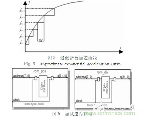 為了更有效、更理想地控製電機的運行,在fpga內部設計了加減速曲線模塊。文中采用了一種近似指數加減速曲線的方法,如圖5為近似指數加速曲線,減速曲線與之對稱。速度等距分布,那麼在該速度級上保持的時間不一樣場。為了簡化,用速度級數N與一個常數C的乘積去模擬並且保持的時間用不熟來代替。因此,速度每升一級,電機都要在該速度級上走NC步(其中N為該速度級數)。