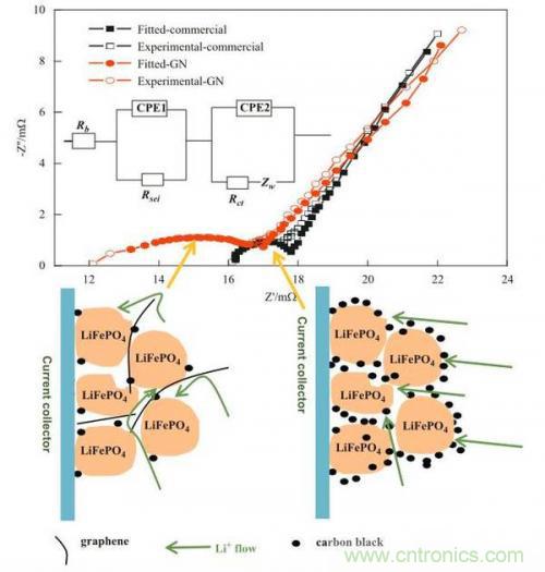 EIS分(fen)析(xi)顯(xian)示(shi),添(tian)加(jia)石(shi)墨(mo)烯(xi)的(de)實(shi)驗(yan)組(zu)電(dian)池(chi)的(de)歐(ou)姆(mu)阻(zu)抗(kang)要(yao)明(ming)顯(xian)低(di)於(yu)對(dui)照(zhao)組(zu)電(dian)池(chi),這(zhe)主(zhu)要(yao)得(de)益(yi)於(yu)石(shi)墨(mo)烯(xi)的(de)片(pian)狀(zhuang)結(jie)構(gou)能(neng)夠(gou)於(yu)活(huo)性(xing)物(wu)質(zhi)顆(ke)粒(li)形(xing)成(cheng)很(hen)好(hao)的(de)接(jie)觸(chu),降(jiang)低(di)接(jie)觸(chu)電(dian)阻(zu),但(dan)是(shi)在(zai)高(gao)頻(pin)段(duan)的(de)電(dian)荷(he)交(jiao)換(huan)阻(zu)抗(kang),實(shi)驗(yan)組(zu)電(dian)池(chi)要(yao)明(ming)顯(xian)高(gao)於(yu)對(dui)照(zhao)組(zu)電(dian)池(chi),這(zhe)表(biao)明(ming)石(shi)墨(mo)烯(xi)的(de)加(jia)入(ru)影(ying)響(xiang)了(le)Li+在電極內的擴散。仿真結果顯示,主要是由於石墨烯的片狀結構對Li+的擴散形成了阻礙,導致Li+的擴撒路徑延長,從而造成了添加石墨烯的鋰離子電池在大電流下極化增加,導致電池的放電容量下降。而傳統的炭黑、導電碳纖維和導電石墨等材料,由於橫截麵較小,因此對Li+的擴散阻礙較小,對鋰離子電池大電流放電性能影響不大。