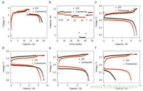 實驗中楊全紅的團隊製作了兩種電池,一種是普通的對照組電池,使用了7%的炭黑和3%的導電石墨,實驗組則使用1%的石墨烯和1%炭黑作為導電劑。試驗結果顯示,在相同的塗布量的前提下,使用石墨烯的實驗組電池容量(0.5C充放電)要(yao)明(ming)顯(xian)高(gao)於(yu)對(dui)照(zhao)組(zu)電(dian)池(chi),並(bing)且(qie)兩(liang)者(zhe)的(de)循(xun)環(huan)性(xing)能(neng)接(jie)近(jin),表(biao)明(ming)石(shi)墨(mo)烯(xi)能(neng)夠(gou)搭(da)建(jian)起(qi)更(geng)為(wei)高(gao)效(xiao)的(de)導(dao)電(dian)網(wang)絡(luo),從(cong)而(er)減(jian)少(shao)導(dao)電(dian)劑(ji)的(de)用(yong)量(liang),提(ti)高(gao)鋰(li)離(li)子(zi)電(dian)池(chi)的(de)容(rong)量(liang)(10%),降低電池的極化,提升電池的能量密度。