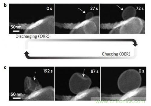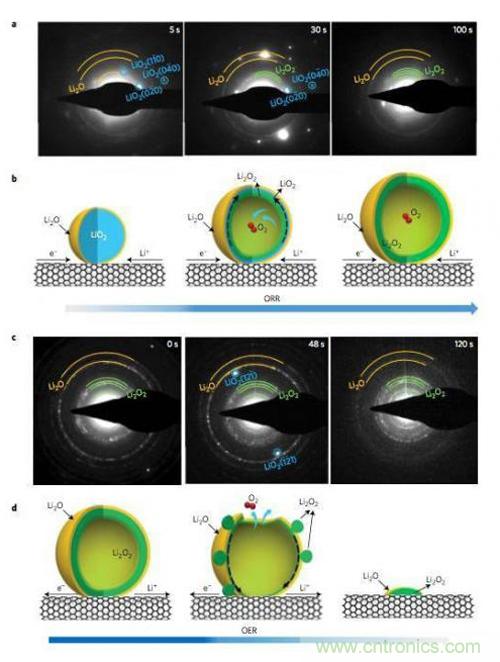 研究顯示,初始反應產物LiO2很快會發生歧化反應生成Li2O2和O2,在顆粒內部釋放的O2被封鎖在了顆粒的內部,從而導致了顆粒成為中空結構,如下圖所示。從SAED的分析結果來看,在開始的幾秒鍾時間內,反應產物中隻有LiO2,30秒之後,Li2O2和LiO2開始共存,大約100s後LiO2的衍射峰消失,反應產物隻剩下Li2O2和Li2O,TEM分析結果顯示中空球的外側為Li2O,內側為Li2O2。充電過程則正好相反,開始的時候觀察到了Li2O和Li2O2的衍射峰,在48s時出現了LiO2的衍射峰,但是在120s時並沒有再出現LiO2的衍射峰,說明LiO2隻是Li2O2分解的一個中間產物。整個過程為我們揭示了Li-O2電池的充放電反應途徑,在放電的時候,Li+通過電解液擴散到CNT表麵,在三相界麵發生反應,生成LiO2,然後LiO2發生歧化反應(LiO2?Li2O2+O2),生成Li2O2和O2,反應釋放的O2會將反應產物從最初的10nm左右,吹到100nm左右,而在產物的表麵由於有豐富的Li+,因此會與O2反應生成Li2O。在充電的過程中,Li2O2首先會失去一個Li+和一個電子,形成LiO2,隨後LiO2發生分解,產生Li2O2和O2,然後Li2O2再次失去Li+和電子,如此循環指導所有的Li2O2消耗完畢。