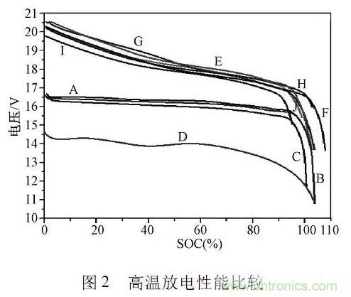 高(gao)溫(wen)情(qing)況(kuang)下(xia),電(dian)池(chi)內(nei)部(bu)離(li)子(zi)移(yi)動(dong)速(su)度(du)增(zeng)大(da),濃(nong)差(cha)極(ji)化(hua)和(he)電(dian)化(hua)學(xue)極(ji)化(hua)減(jian)輕(qing),極(ji)化(hua)內(nei)阻(zu)減(jian)小(xiao),電(dian)池(chi)內(nei)部(bu)化(hua)學(xue)反(fan)應(ying)熱(re)增(zeng)大(da),過(guo)分(fen)高(gao)溫(wen)會(hui)使(shi)隔(ge)膜(mo)發(fa)生(sheng)收(shou)縮(suo),電(dian)解(jie)液(ye)發(fa)生(sheng)副(fu)反(fan)應(ying),造(zao)成(cheng)電(dian)池(chi)壽(shou)命(ming)穩(wen)定(ding)性(xing)降(jiang)低(di)GB/T31486要求電池在室溫下充滿電,55℃高溫下儲存5h後評價動力電池的放電容量電池樣品的高溫放電性能比較如圖2所示。