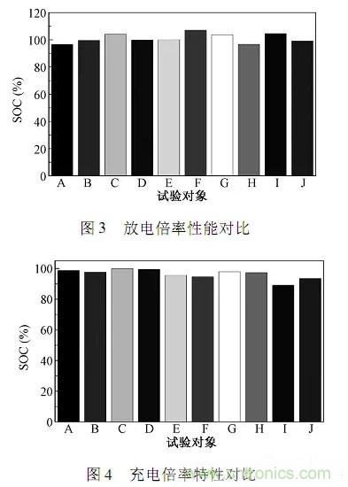 GB/T31486以動力電池在3C電流強度放電來考核其放電倍率;以2C電流強度充電,且充電時長控製在30min內,來考核電池的充電倍率特性。放電倍率特性對比如圖3所示;充電倍率特性對比如圖4所示。