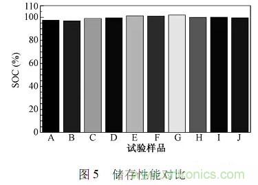 GB/T31486要求動力電池模塊充滿電,室溫下以1C放電30min後,在45±2℃下儲存28天,評價電池的容量恢複能力電池樣品儲存性能對比如圖5所示。