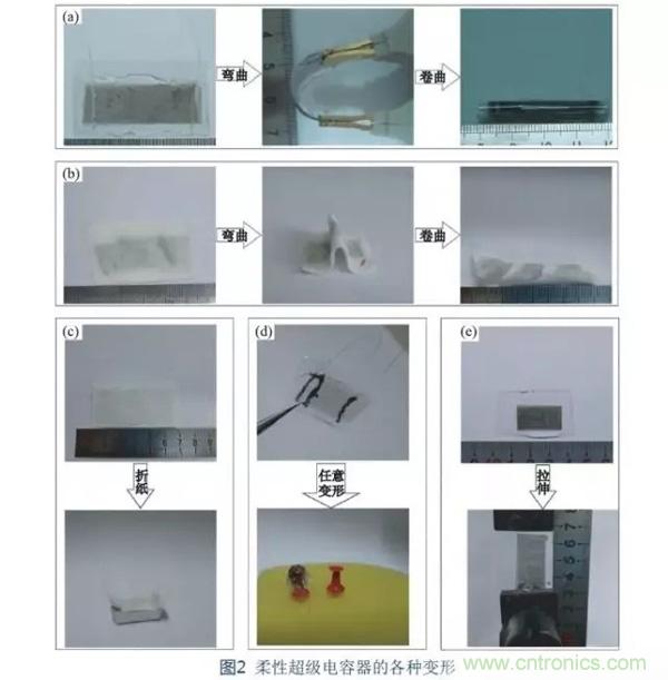根據柔性基底性質的不同,對電容器采取不同的變形性能測試,如彎曲、拉伸、折紙、任意變形等(圖2)。ceshijieguofaxian,gezhongbianxinghoudianrongqirengkebaochiwendingdedianrongxingneng,bingqiekeyichengshoushangbaicibianxing,juyouhenhaodebianxingwendingxing。zaishijiqingkuangzhongdongtaibianxinggengjiachangjian,errouxingchaojidianrongqizaibianxingguochengzhongrengkebaochiwendingdedianhuaxuexingneng,jijuyouyouyidedongtaibianxingxingneng。