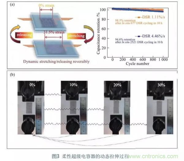 Zang等充分利用石墨烯網狀薄膜可與基底緊密結合的特點,獲得以預拉伸後的褶皺PDMS為基底、石墨烯網狀薄膜為電極材料的可動態拉伸(彎曲)超級電容器。動態拉伸(彎曲)頻率可高達60%/s。拉伸過程通過CV曲線進行實時檢測,結果表明,動態拉伸(彎曲)過程中未見明顯的性能破壞,具有很好的動態變形性能。