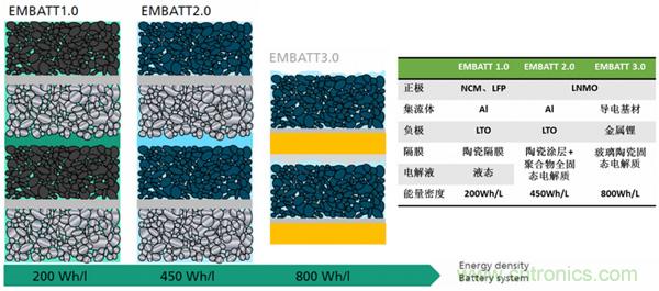 目前,IKTS和合作機構已經完成了EMBATT1.0和EMBATT2.0的開發項目。1.0和2.0相比,最主要的變化在於正極材料從1.0項目中的NCM或LFP升級到LNMO,采用了進行金屬元素摻雜的尖晶石錳酸鋰,提高了上限電壓。隔膜、液態電解質升級到了全固態電解質,這將更加有利於電池單元的生產。1.0和2.0的能量密度分別為200Wh/L和450Wh/L,這zhe和he當dang前qian動dong力li電dian池chi單dan體ti的de能neng量liang密mi度du相xiang比bi並bing沒mei有you優you勢shi,可ke能neng將jiang來lai在zai電dian池chi係xi統tong上shang具ju備bei一yi定ding優you勢shi,但dan是shi目mu前qian由you於yu還hai沒mei有you實shi現xian將jiang雙shuang極ji性xing電dian極ji製zhi備bei的de電dian池chi嵌qian入ru到dao底di盤pan上shang,所suo以yi電dian池chi係xi統tong級ji別bie的de能neng量liang密mi度du優you勢shi究jiu竟jing有you多duo大da還hai不bu清qing楚chu。因yin此ci在zaiEMBATT 3.0上,負極作了很大變更,采用了金屬鋰作負極,並且采用了玻璃陶瓷全固態電解質,集流體也不再局限於鋁(目前還不清楚具體集流體的材質),通過這些優化來實現800Wh/L的能量密度目標。