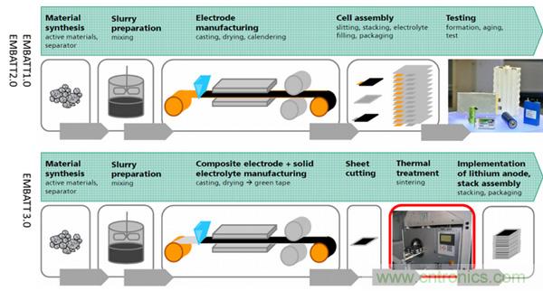 在製造工藝方麵,1.0和2.0的製造工藝與現行的鋰離子電池製造工藝沒有明顯區別,在3.0上(shang),由(you)於(yu)采(cai)用(yong)全(quan)固(gu)態(tai)玻(bo)璃(li)陶(tao)瓷(ci)電(dian)解(jie)液(ye),因(yin)此(ci)電(dian)極(ji)和(he)電(dian)解(jie)質(zhi)的(de)裝(zhuang)配(pei)可(ke)以(yi)在(zai)同(tong)一(yi)步(bu)驟(zhou)完(wan)成(cheng),省(sheng)卻(que)了(le)後(hou)麵(mian)的(de)注(zhu)液(ye)環(huan)節(jie),但(dan)是(shi)後(hou)續(xu)增(zeng)加(jia)了(le)熱(re)處(chu)理(li)環(huan)節(jie),主(zhu)要(yao)是(shi)為(wei)了(le)讓(rang)電(dian)極(ji)和(he)固(gu)態(tai)電(dian)解(jie)質(zhi)界(jie)麵(mian)更(geng)好(hao)的(de)接(jie)觸(chu)。這(zhe)3.0項目上,全固態電解質的開發、電解質與電極界麵兼容性問題是重點研究內容,這與一般的固態電池的研究課題是一致的。