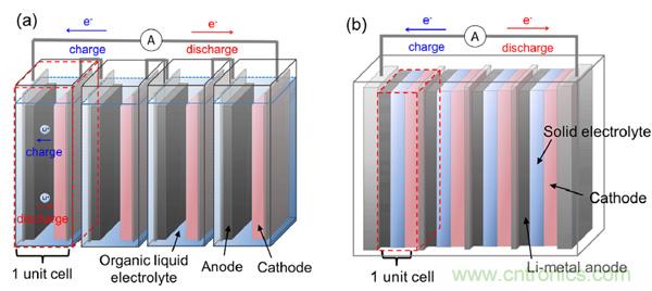 下圖對比了傳統鋰離子電池(a圖)和雙極性鋰電池(b圖,這裏是以金屬鋰和全固態為例)。a圖中,每個電池單元unit cell包括了正極(一般塗覆在Al基材)、負極(一般塗覆在Cu基材);b圖中,每個電池單元unit cell同樣包括了正極、負極,但是正極、負極活性材料共用一個基材:當兩個電池單元串聯起來時,雙極性電極的一側在當前單元電池作為負極,另一側在相鄰單元電池中是作為正極。