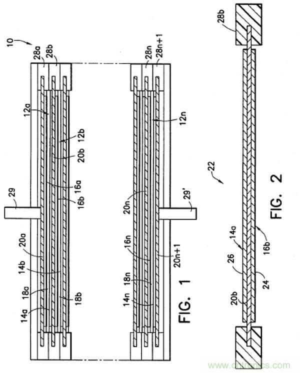 雙極性電極的研究早在二、三十年以前就已經出現。例如在20實際九十年代,美國雅迪尼(Yardney)技術公司就對雙極鋰離子電池展開了研究。雙極性電池設計可以將單元電池cell-stack中相鄰cell之間的電阻最小化,使得每個雙極性cell種的正負極活性塗層表麵上的電流和電勢達到更加均勻的分布,因此,采用雙極性cell構成的電池具有更高的功率特性。下圖Fig1是一個典型的由多個雙極性電池單元構成的雙極性鋰離子電池截麵圖,Fig2是提取出來的其中一個雙極性電池單元。其中,12a、12b,…,12n是電池單元;14a、14b,…,14n是電池單元的正極側;16a、16b,…,16n是電池單元的負極側;18a、18b,…,18n隔膜;20b、20c,…,20n是集流體(例如,Fig2中的14a和16b共用一個集流體),集流體可采用雙金屬基材,例如,Cu-Al雙金屬,負極活性物質塗敷在Cu側,正極活性物質塗敷在Al側;24是負極活性物質,26是正極活性物質;28a、28b,…,28n是絕緣性連接固定結構,每個雙極性電極通過該連接結構固定起來。在Fig1和Fig2中,一共有n-1個雙極性電極(集流體兩側分別有正極、負極活性物質),最上層20a隻有負極一側,另一側跟負極極柱29相連,最下層20n+1隻有正極一側,另一側跟正極極柱29相連。