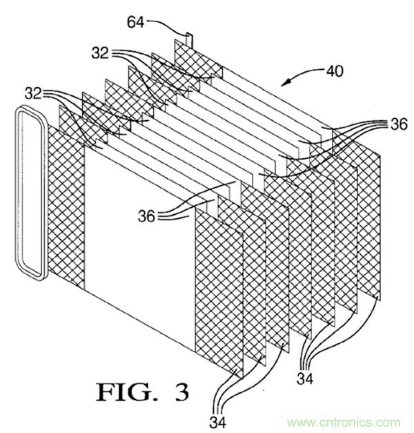 下圖Fig3是雙極性電極的堆疊stack,可以稱之為電堆40。其中,32是隔膜;34是集流體;36是雙極性電極,兩側分別是正負極活性物質。基本結構與上麵的示例是一樣的。