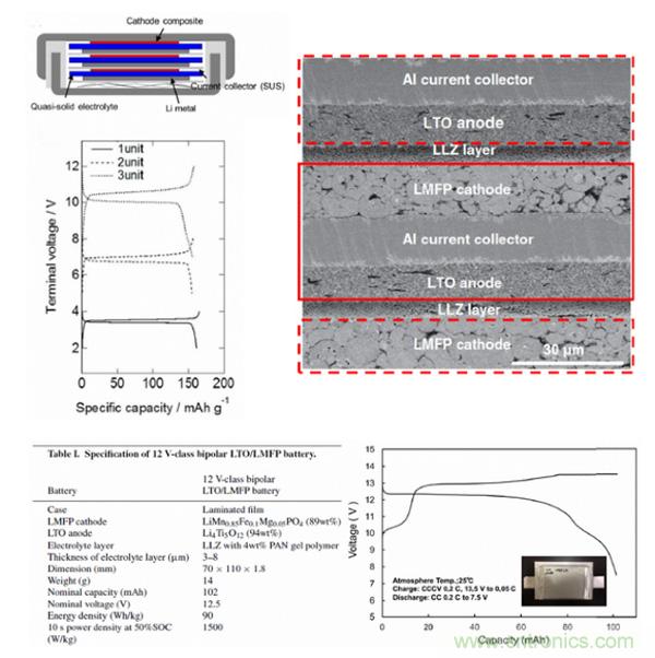 下圖是含有三個雙極性電極的CR2032鈕扣電池。正極是LFP,負極是金屬鋰,采用準固態聚合物電解質和不鏽鋼集流體。從電壓曲線可以看到,隻要改變雙極性電極的unit數量,就能改變電池的電壓,這裏給的分別是1unit、2units、3units的電壓曲線。例如,很容易通過5個雙極性的unit實現一個12V的鋰離子電池,下圖右側是日本東芝公司的一個12V雙極性電池的部分截麵圖,從表1的參數中可以看到,這裏正極材料是LiMn0.85Fe0.1Mg0.05PO4,負極材料是LTO,集流體是Al,固態電解質電解質是Li7La3Zr2O12(LLZ)和PAN。從封裝方式來看,疊片式軟包裝是比較適合雙極性電池的一種方式。
