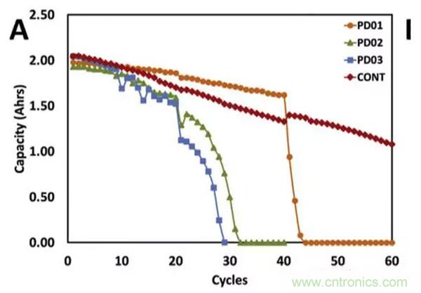 針對三個階段電池的衰降機理的研究認為,階段1可能是因為電池SEI膜生長需要消耗一部分Li+,因此衰降速度較快。在階段2隨著SEI膜結構的穩定,內部較為穩定,因此衰降速度較慢,在階段3隨著電池老化,開始發生活性物質損失,電極活性界麵減少,導致電池對於電流十分敏感。圖C是針對不同的截止電壓對電池衰降速度影響的實驗,從實驗結果可以看到,當把充電截止電壓提高到4.3V時會導致電池的循環性能急劇惡化,降低充電截止電壓可以有效的改善電池的循環性能。