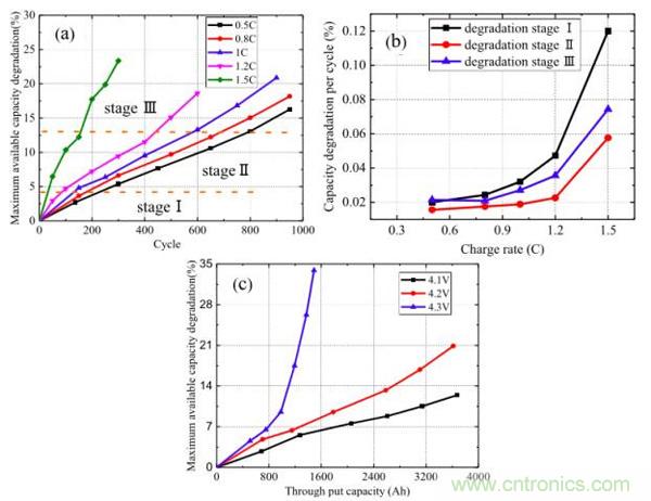 對於1C倍率充電,前150次衰降速率為0.032%/循環,150次-600次衰降速率為0.0188%/循環,600次以後衰降速度為0.0271%/循環。1.2C充電,前100次衰降速度為0.0472%/循環,100次-400次衰阿醬速度為0.0226%/循環,400次以後衰降速度為0.0356%/循環。1.5C倍率充電與其他倍率充電的電池具有很大的不同,平均衰減速度為0.078%/xunhuan,yuanyuankuaiyuqitabeilvxiachongdiandedianchi。congshangshushujukeyikandao,suizhechongdiandebeilvdejiada,lilizidianchideshuaijiangsulvyezaikuaisuzengjia,bingqiecongquxiandexielvlaikan,dianchideshuaijiangsuducunzaisangebutongdejieduan,qianqishuaijiangsudujiaokuaidejieduan(階段1),中間衰降速度較慢的穩定階段(階段2),和後期的衰降速率加速階段(階段3)。