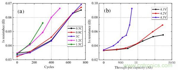 對電池的動態內阻分析如下圖所示,從圖a測試結果來看,當充電電流小於1C時,電池動態內阻隨著電池循環的變化趨勢幾乎時一樣的,但是當充電電流超過1C時,電池動態內阻增加速度會隨著充電速率的增加而快速增加。從圖b的測試結果來看,當充電截止電壓為4.3V時,電池動態內阻增加非常迅速表明高截止電壓會惡化電池的動力學條件,截止電壓為4.1V和4.2V時電池動態內阻增加較為緩慢。