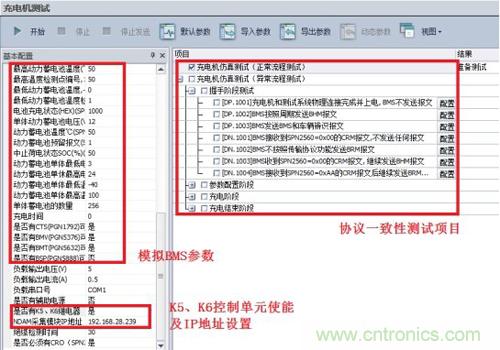 · 啟動CANScope對應的充電樁協議一致性測試軟件ChargerBMS_Tester,選擇BMS仿真測試,配置相應信息主要包括模擬的BMS參數、K5、K6控製單元使能及IP地址設置。