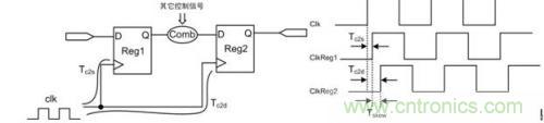 時序偏斜分析圖如圖 3所示。時鍾的分析起點是源寄存器(Reg1),終點是目標寄存器(Reg2)。時鍾在圖中的結構中傳輸也會有延遲,時鍾信號從時鍾源傳輸到源寄存器的延時為Tc2s,傳輸到目標寄存器的延時為Tc2d。時鍾網絡的延時為Tc2s與Tc2d之差,即Tskew=Tc2d-Tc2s。