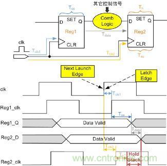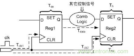 如圖 6所示,為分析建立時間/保持時間的基本電路圖。Tclk1為Reg1的時鍾延時,Tclk2為Reg2的時鍾延時,Tco為Reg1固有延時,Tdata為Reg1的到Reg2之間組合邏輯的延時,Tsu為Reg2的建立時間,Th為Reg2的保持時間,設時鍾clk周期為T,這裏分析數據的建立時間和保持時間。
