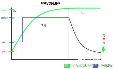 電池在充電時通常經曆兩個階段:恒定電流(CC)和恒定電壓(CV)。圖1所示為4.2V鋰離子(Li-ion)電池的典型充電曲線。當大部分能量從充電器傳輸到電池時,CC大致用於充電的前67%時間。在剩餘充電時間的最後33%內,則是恒定電壓,以充分充電並保持電充滿。考慮到放電電流,並保持電池電壓完全充電,一些充電器在CV期間泵送小電流(也稱為涓流充電)。電池完全充電所需的時間取決於其容量和最大允許充電電流,是電池化學和環境溫度的函數。例如,如果您有一個容量為3000mAh,充電率為0.8C的鋰離子電池(其中C表示在一小時內為電池充電所需的電流,這是電池製造商建議延長電池壽命的默認電量),電池需要兩到三個小時才能完全充滿電。