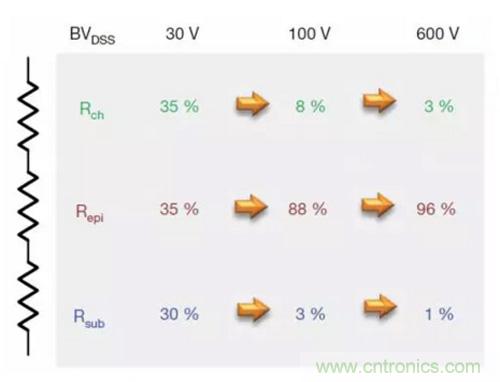圖2顯示平麵式MOSFET情況下構成RDS(on) 的各個分量。對於低壓MOSFET,三個分量是相似的。但隨著額定電壓增加,外延層需要更厚和更輕摻雜,以阻斷高壓。額定電壓每增加一倍,維持相同的RDS(on)所需的麵積就增加為原來的五倍以上。對於額定電壓為600V的MOSFET,超過95%的電阻來自外延層。顯然,要想顯著減小RDS(on)的值,就需要找到一種對漂移區進行重摻雜的方法,並大幅減小epi電阻。